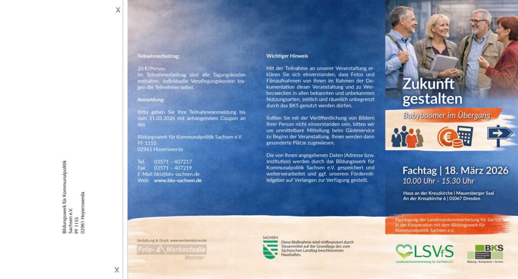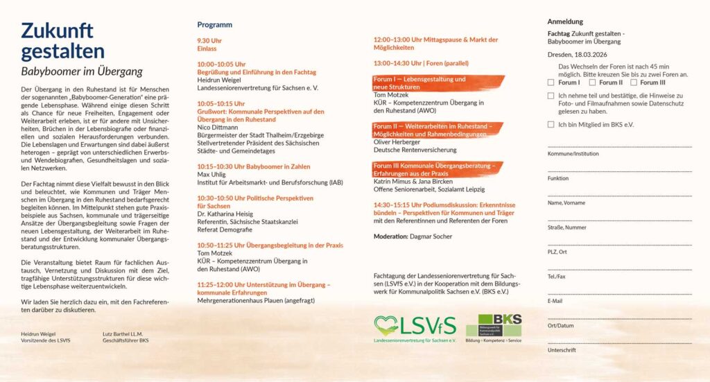 Der Fachtag nimmt diese Vielfalt bewusst in den Blick und beleuchtet, wie Kommunen und Träger Menschen im Übergang in den Ruhestand bedarfsgerecht begleiten können. Im Mittelpunkt stehen gute Praxisbeispiele aus Sachsen, kommunale und trägerseitige Ansätze der Übergangsbegleitung sowie Fragen der neuen Lebensgestaltung, der Weiterarbeit im Ruhestand und der Entwicklung kommunaler Übergangsberatungsstrukturen.
