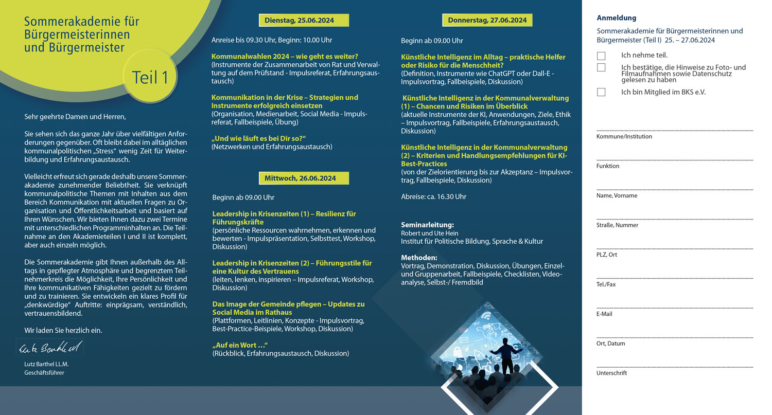 Vielleicht erfreut sich gerade deshalb unsere Sommerakademie zunehmender Beliebtheit. Sie verknüpft kommunalpolitische Themen mit Inhalten aus dem Bereich Kommunikation mit aktuellen Fragen zu Organisation und Öffentlichkeitsarbeit und basiert auf Ihren Wünschen. Wir bieten Ihnen dazu zwei Termine mit unterschiedlichen Programminhalten an. Die Teilnahme an den Akademieteilen I und II ist komplett, aber auch einzeln möglich.