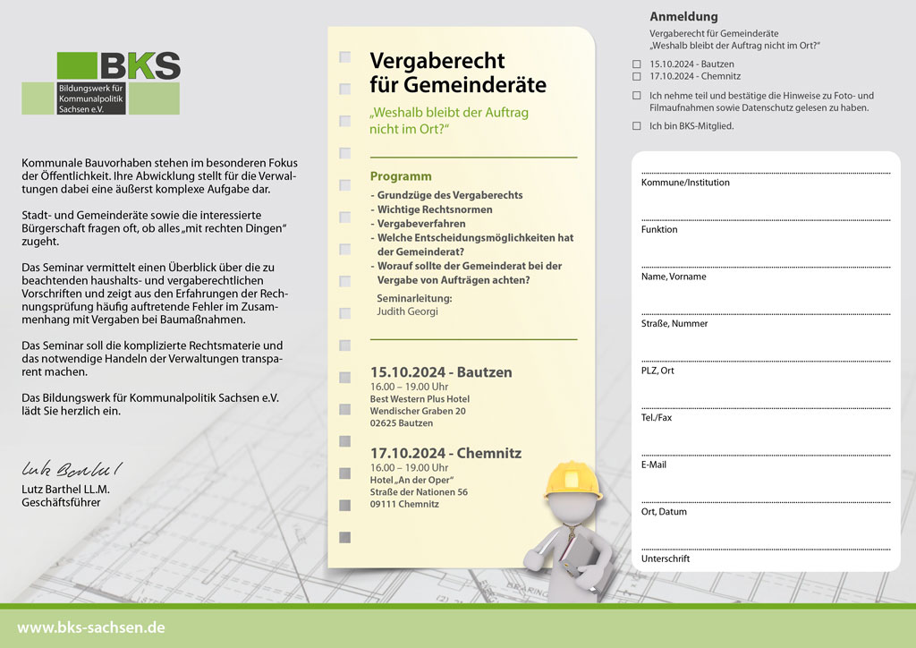 Das Seminar vermittelt einen Überblick über die zu beachtenden haushalts- und vergaberechtlichen Vorschriften und zeigt aus den Erfahrungen der Rechnungsprüfung häufig auftretende Fehler im Zusammenhang mit Vergaben bei Baumaßnahmen.